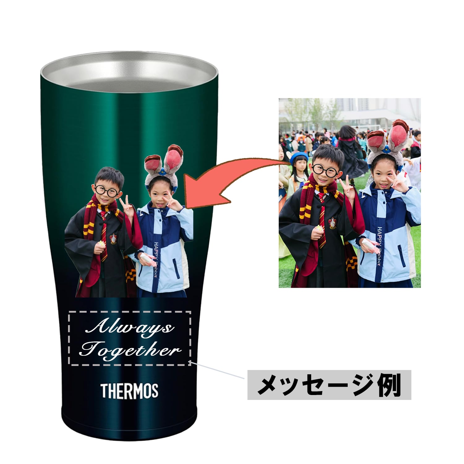 サーモスの真空断熱構造を持つタンブラーに、心温まる「ありがとう」のメッセージを印刷します。