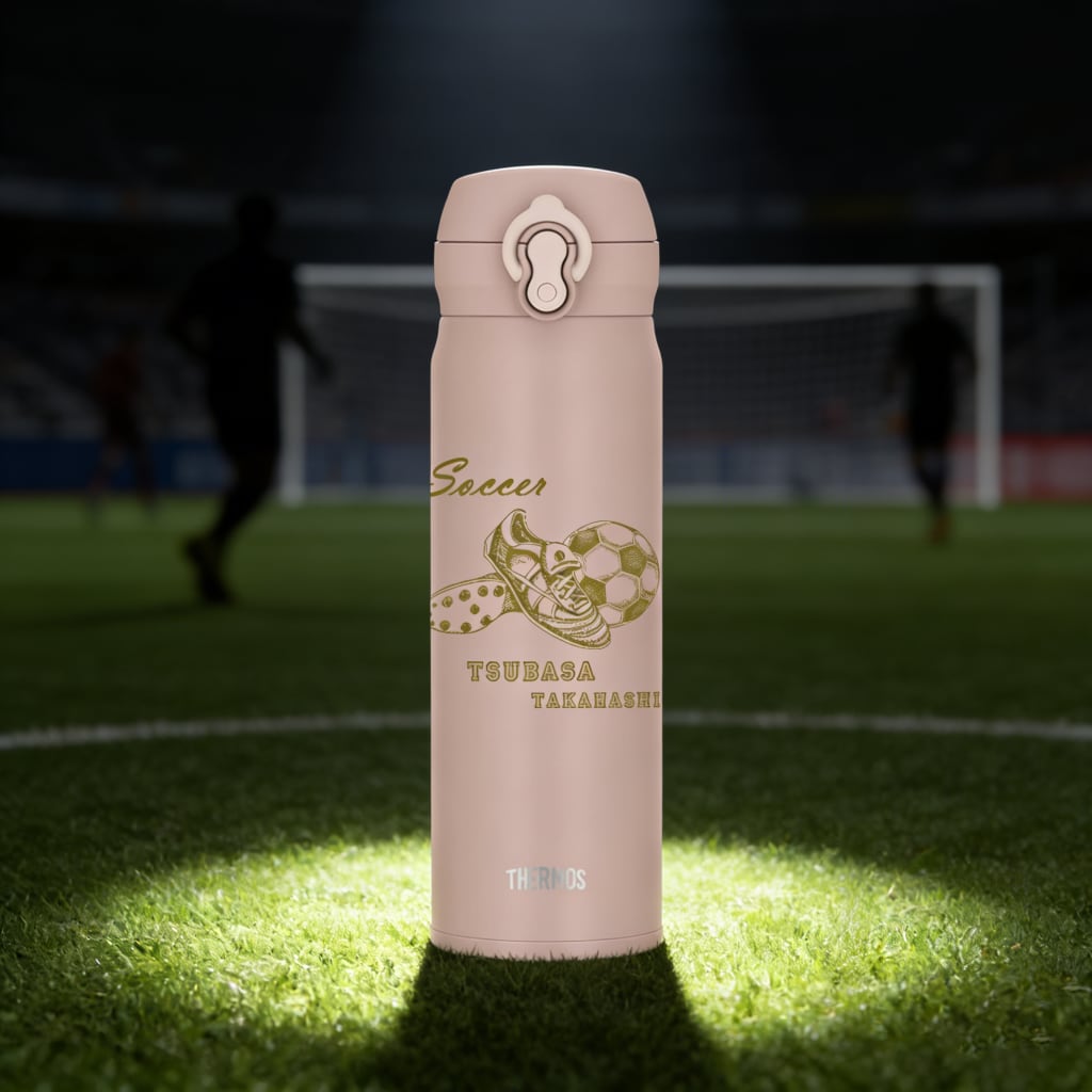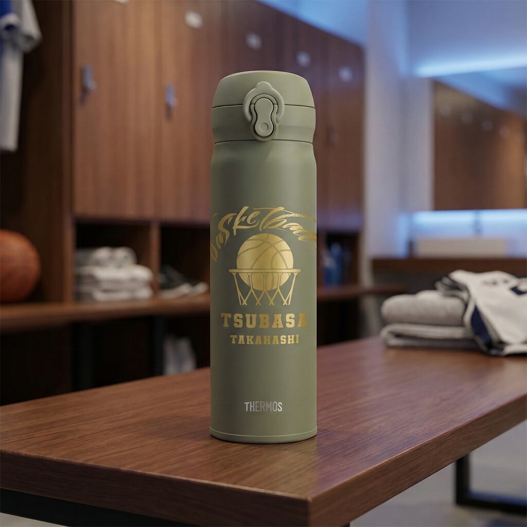 サーモスの真空断熱構造を持つステンレス製の水筒に、オリジナルの名入れ彫刻を施します。