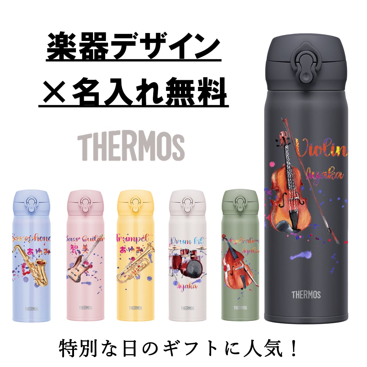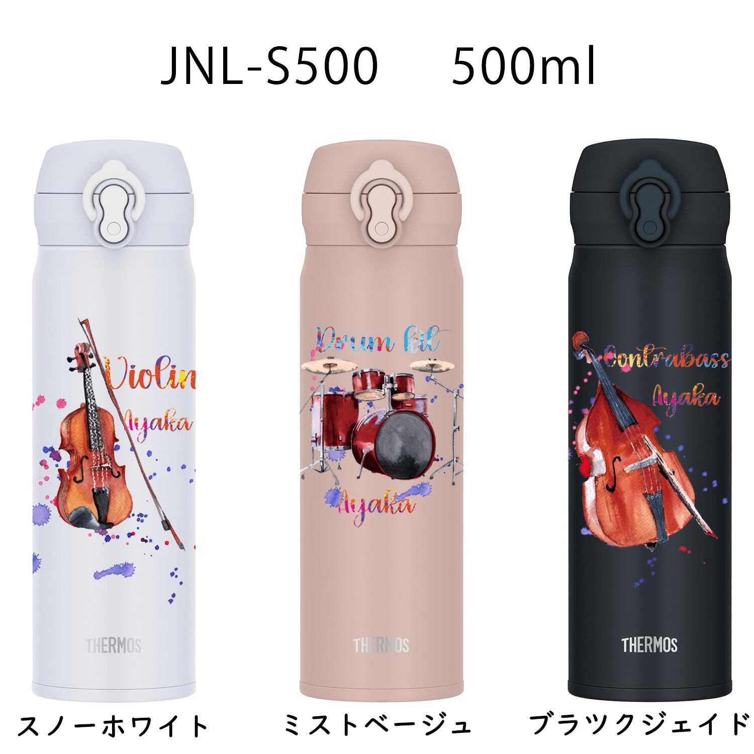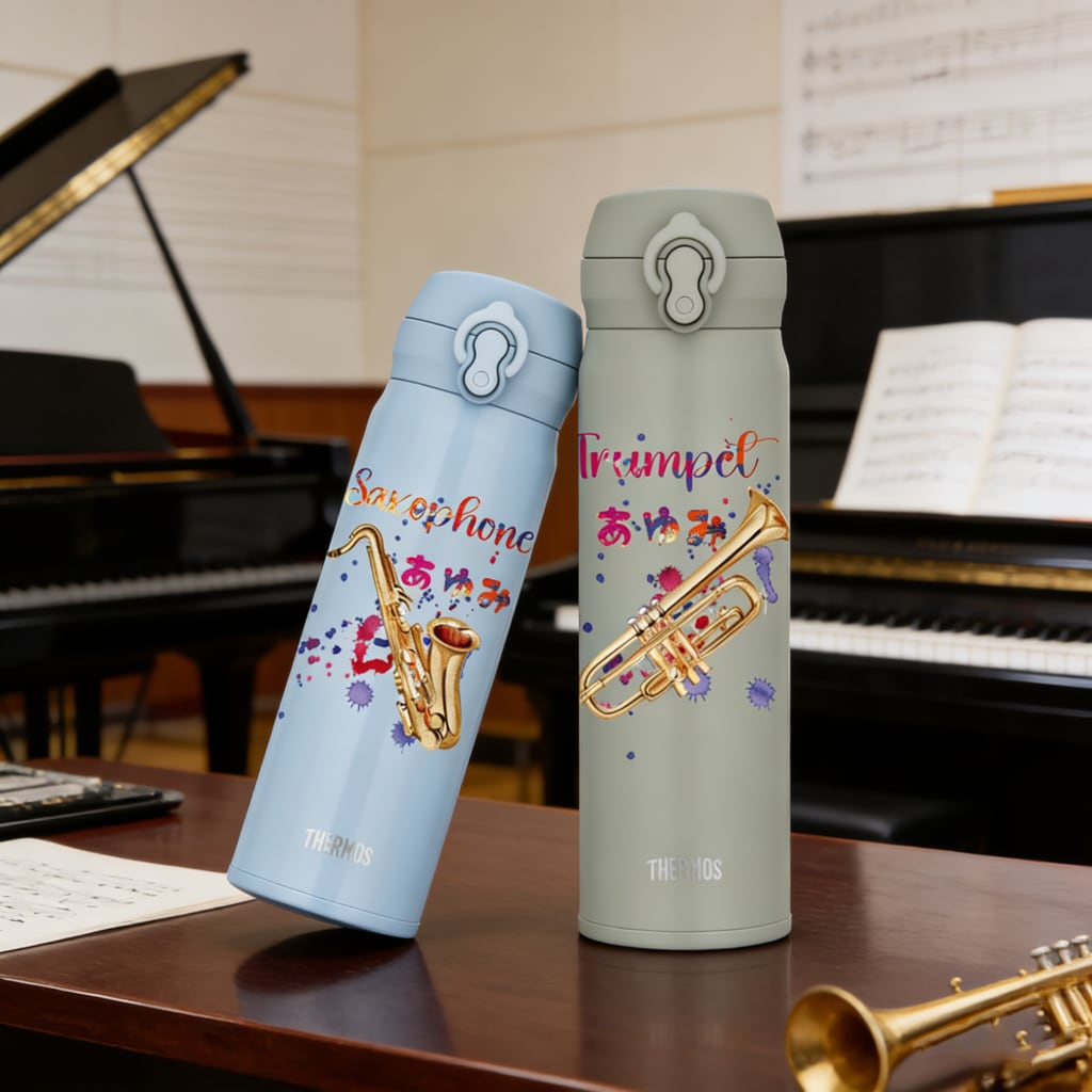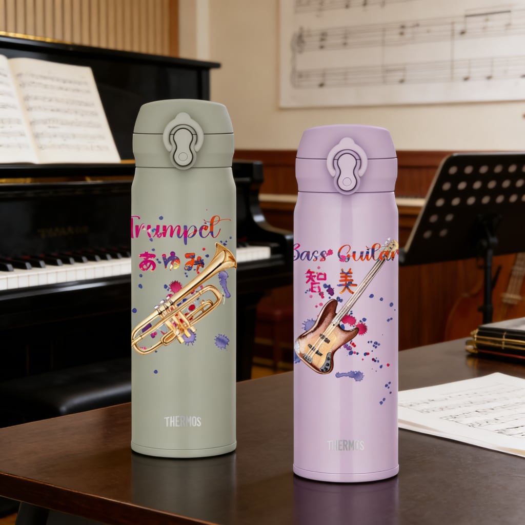 サーモスの500mlサイズの真空断熱水筒に、あなたの特別な楽器デザインと名入れを施します。